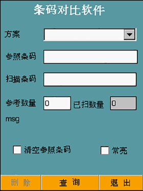 先設(shè)定參照條碼作為標(biāo)準(zhǔn)條碼,掃描核對條碼,條碼信息與參照條碼信息進(jìn)行核對,信息相符則提示通過,否則提示條碼錯誤。條碼對比規(guī)則可根據(jù)現(xiàn)場實際情況設(shè)定。