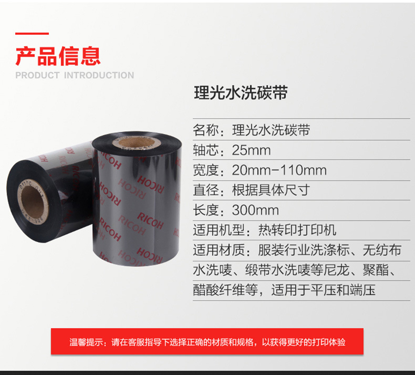 注:此款D110A為全樹脂水洗專用碳帶,適用于服裝水洗嘜、尼龍標(biāo)簽。
