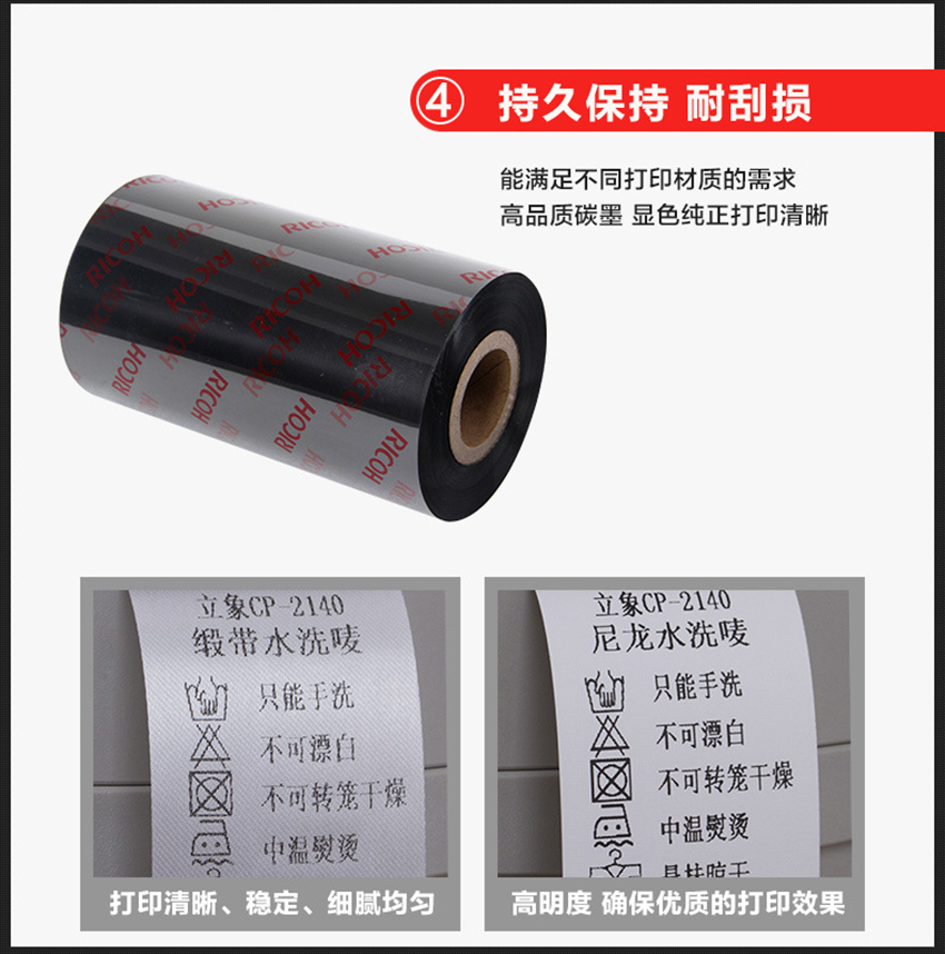 注:此款D110C為全樹脂水洗專用碳帶,適用于服裝水洗嘜、尼龍標(biāo)簽。