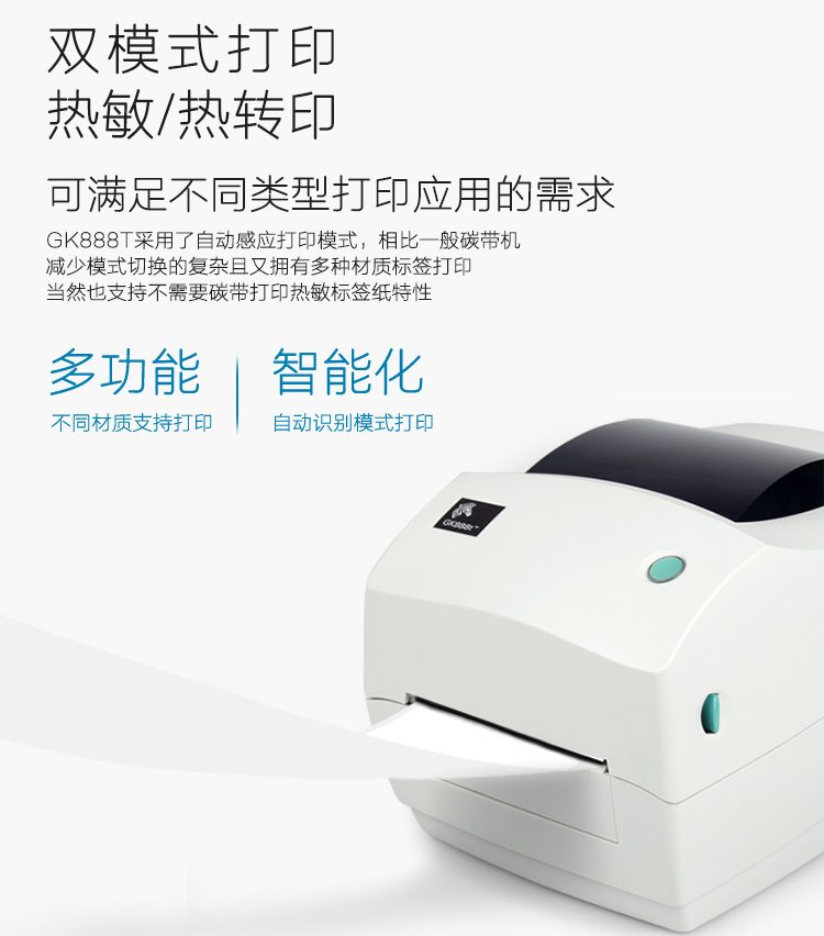Zebra GK888t條碼打印機(jī)是一款非常實(shí)用的桌面型條碼打印機(jī),適用于各類中、低量打印應(yīng)用。主要應(yīng)用于零售,辦公室和快遞面單打印這塊。Zebra GK888t采用了節(jié)省空間的設(shè)計(jì),Zebra GK888t使用強(qiáng)大的 32 位處理器,可快速打印標(biāo)簽,Zebra GK888t支持簡體和繁體中文字體集,還具備大容量內(nèi)存,可實(shí)現(xiàn)更多的圖片存儲、更長的標(biāo)簽格式以及更快的處理。