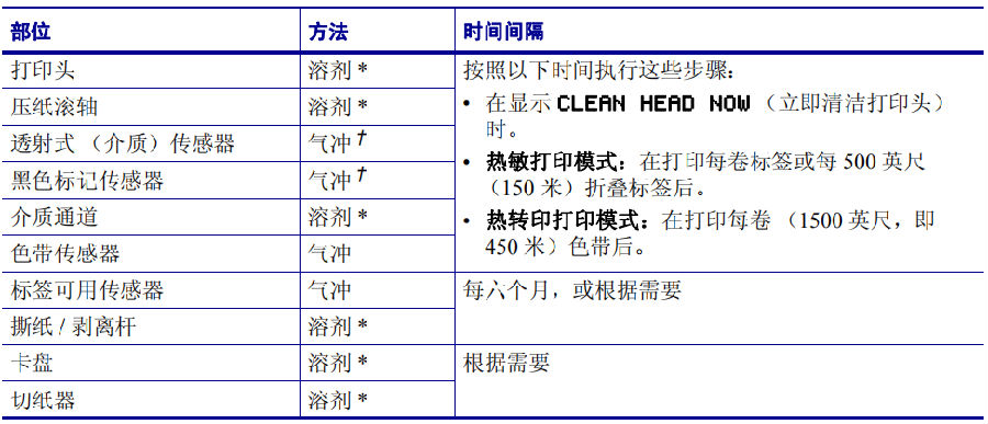 在用完每卷 (1500 英尺或 450 米)熱轉(zhuǎn)印色帶,或每卷 (500 英尺或 150 米)熱敏標(biāo)簽,或液晶顯示屏上顯示 CLEAN HEAD NOW (立即清潔打印頭)時(shí),應(yīng)清潔打印頭。如果發(fā)現(xiàn)條形碼或圖形中有打印空白等打印質(zhì)量不均勻現(xiàn)象,應(yīng)更為頻繁地清潔打印頭。