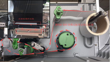 1.3標(biāo)簽的安裝,標(biāo)簽紙張 要經(jīng)過傳感器,安裝好標(biāo)簽紙后要合蓋好打印頭,如下圖示(剝離模式)