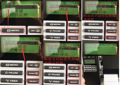 1.5打印機(jī)校準(zhǔn)設(shè)置操作,如下圖1-9步驟進(jìn)行自動(dòng)校準(zhǔn),會(huì)出幾張空白標(biāo)簽后,按FEED鍵每次出一張停在同一位置表示校準(zhǔn)成功.