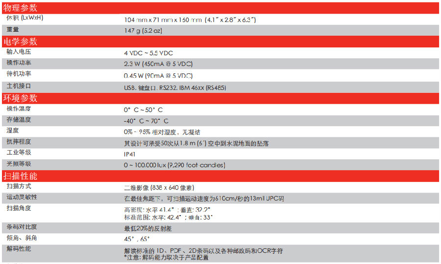 Honeywell霍尼韋爾1900二維影像條碼掃描槍參數(shù)